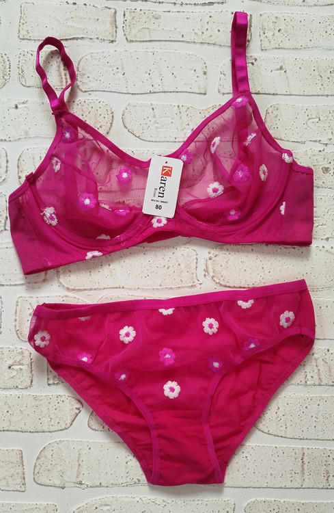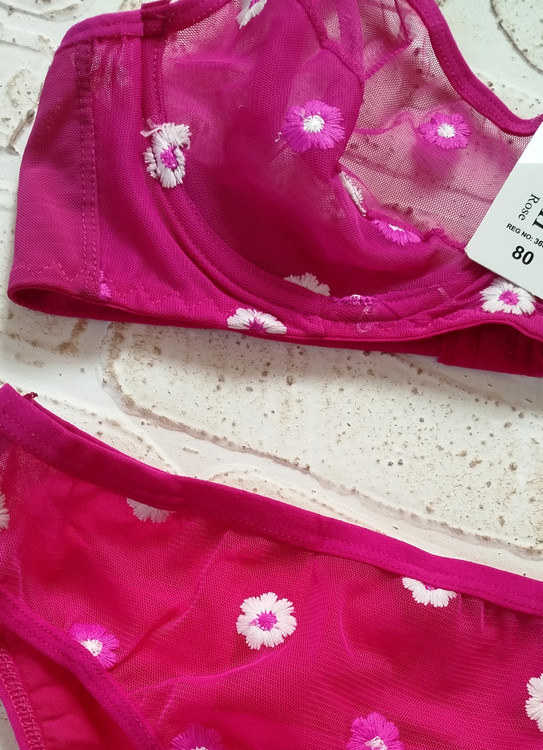ست شورت و سوتین تمام تور با گلهای بابونه رنگ سرخابی تک رنگ سوتین فنردار کیفیت عالی و درجه یک