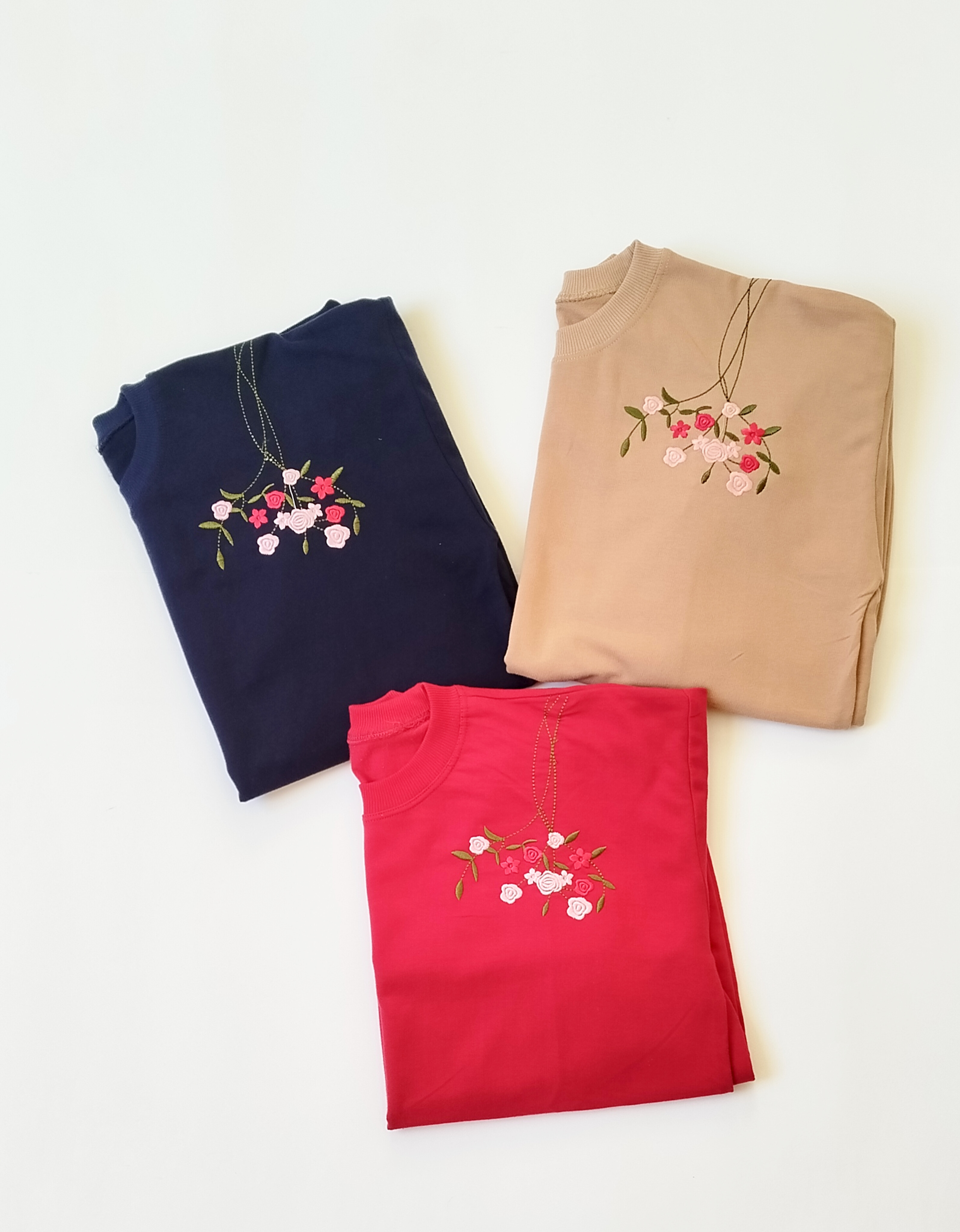 بلوز دورس سه نخ زنانه گلدوزی شده در رنگبندی جذاب و عالی سایز فری مناسب ۳۶ تا ۴۸ قواره دار و عالی آستین کشباف مناسب برای زیر پافر و بارونی