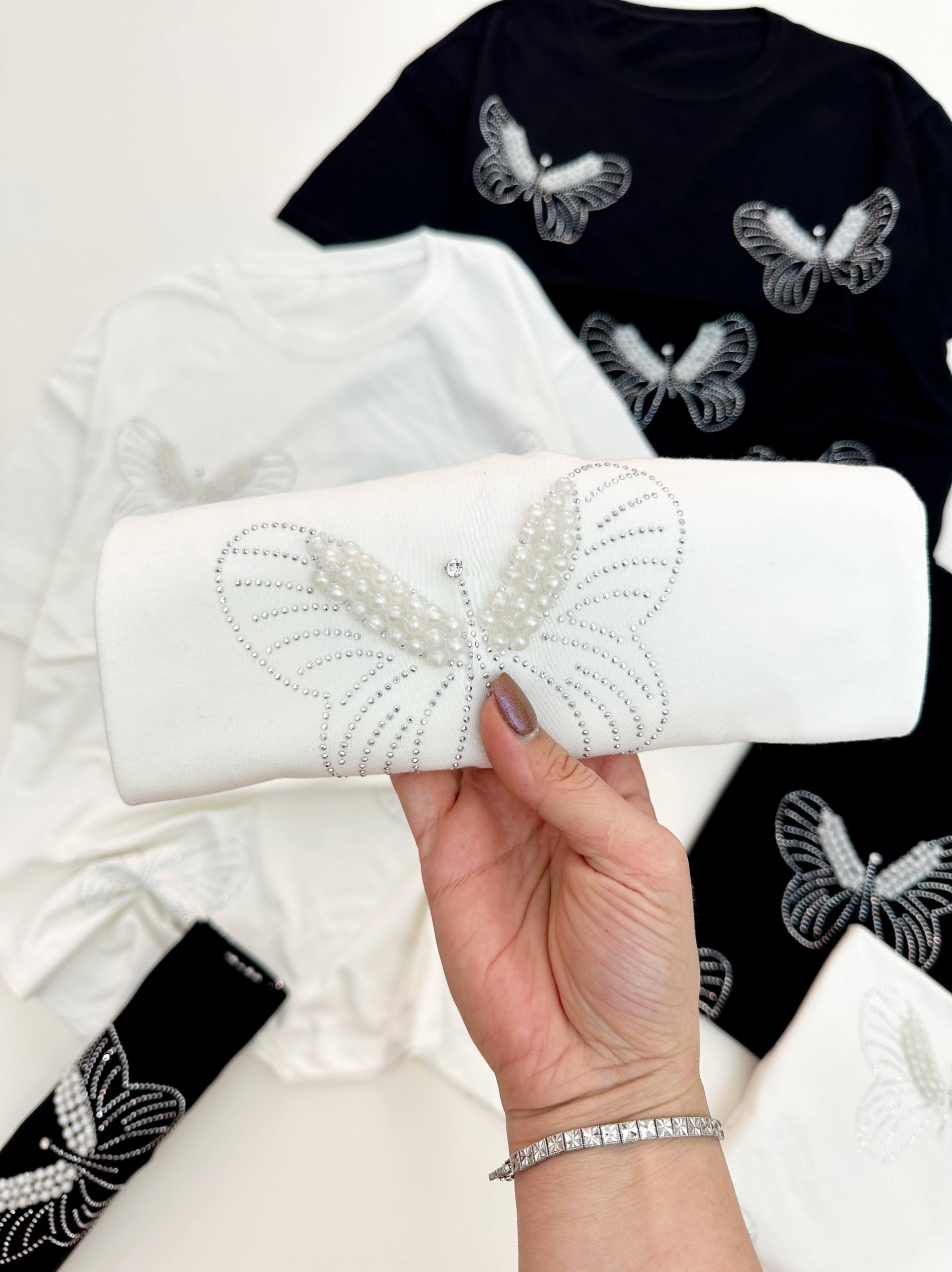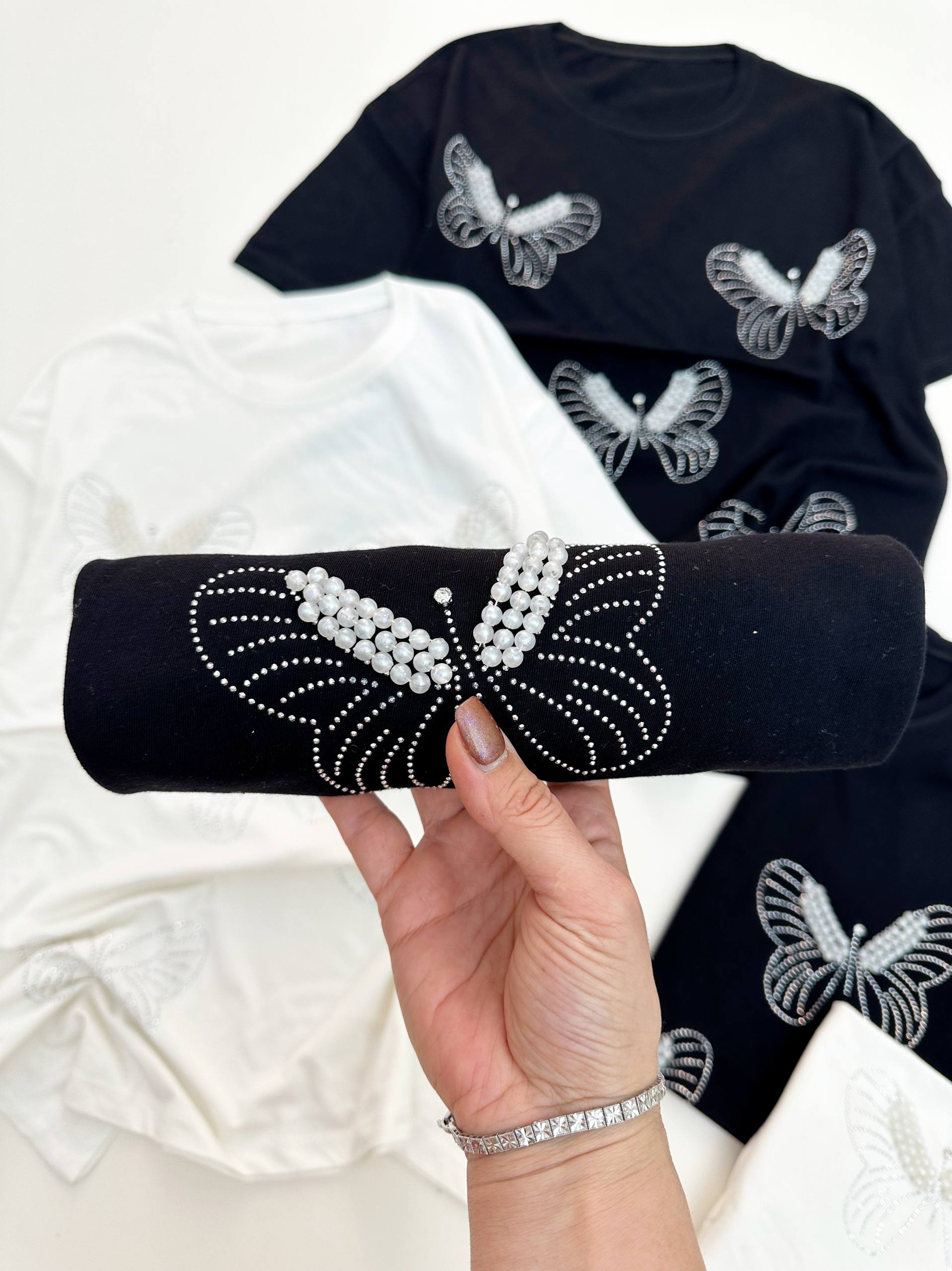 خرید تیشرت کارشده با نگین و مروارید زنانه
